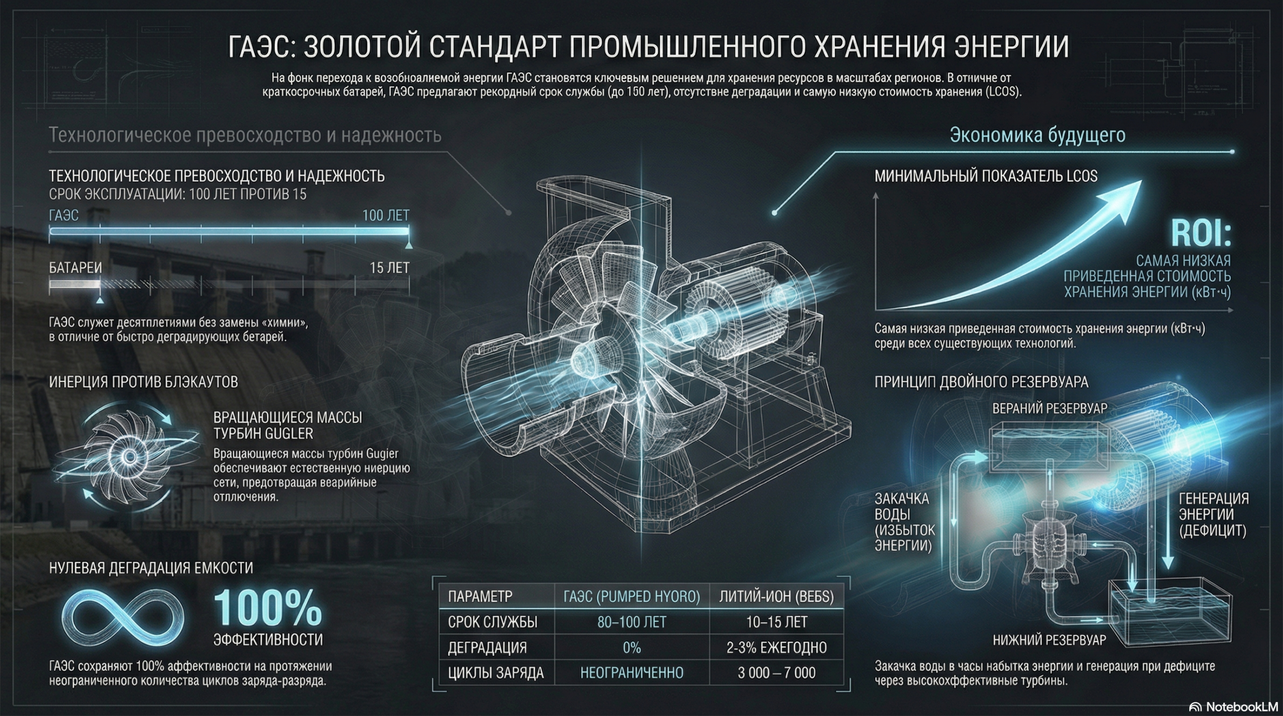 Главное преимущество — инерция. В отличие от батарей, вращающиеся массы ГАЭС обеспечивают естественную инерцию сети, что критически важно для предотвращения аварийных отключений (Blackout).