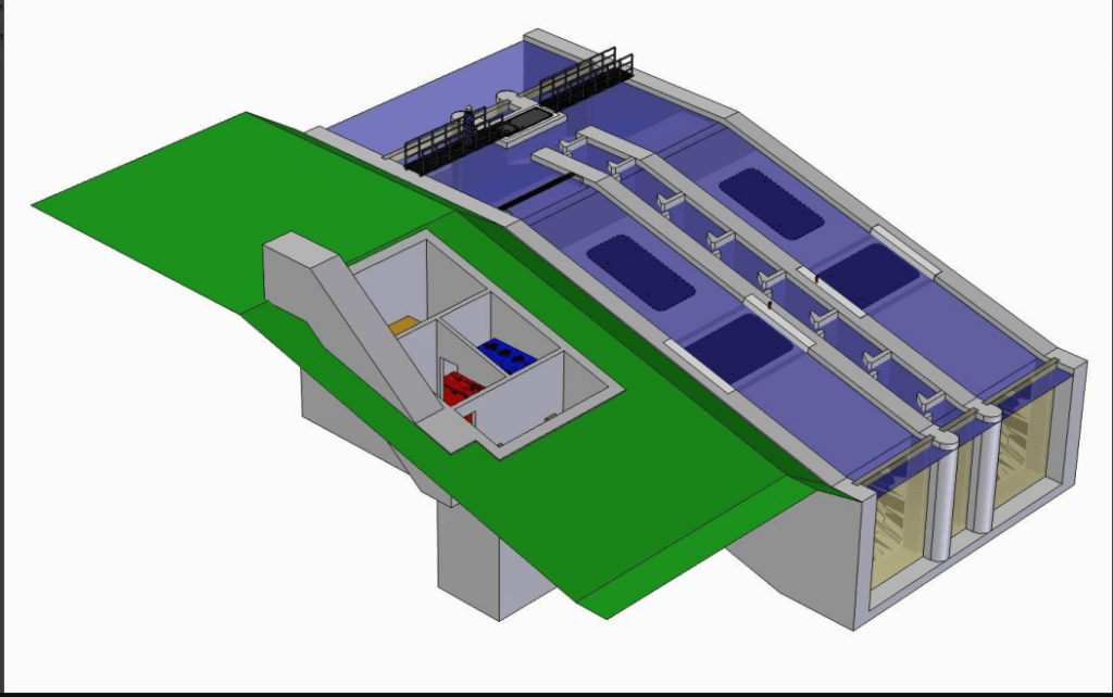 Ночью или в штиль: Вода сбрасывается вниз, вращая турбины Gugler, и выдает чистую энергию в сеть.